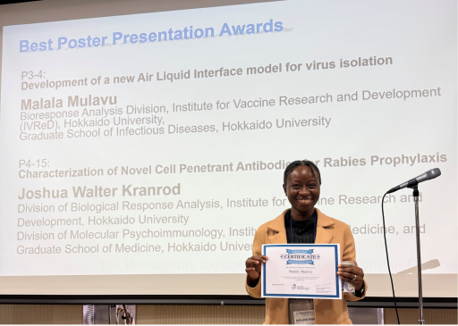 2025年9月25日から26日に北海道大学獣医講堂にて開催された第13回 Sapporo Summer Symposium for One Health(SaSSOH 2025)において、北海道大学大学院国際感染症学院博士課程1年の Malala Mulavu さんおよび北海道大学大学院医学院博士課程1年 Joshua Walter Kranrod さんが、ポスター発表でポスター賞を受賞しました。