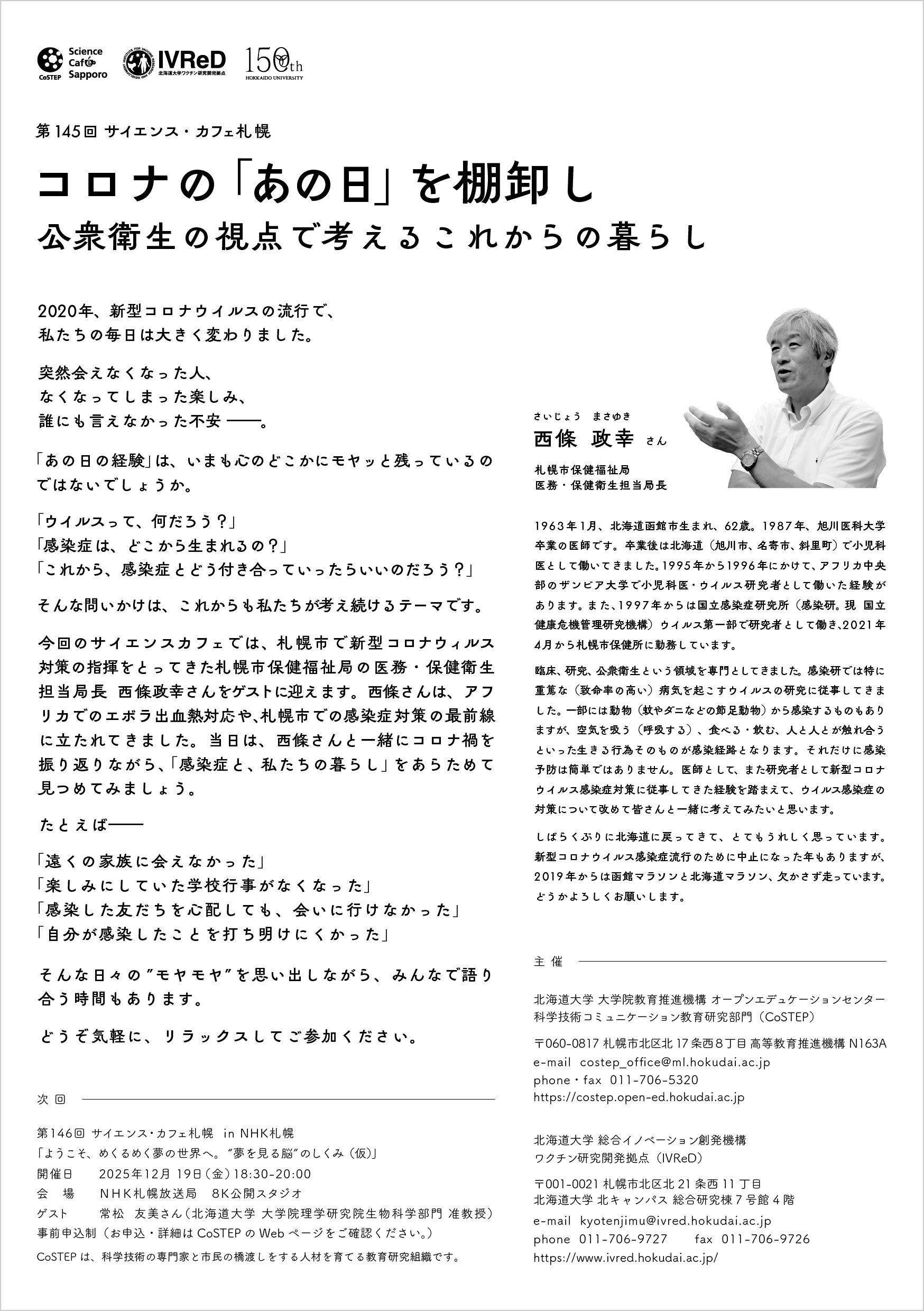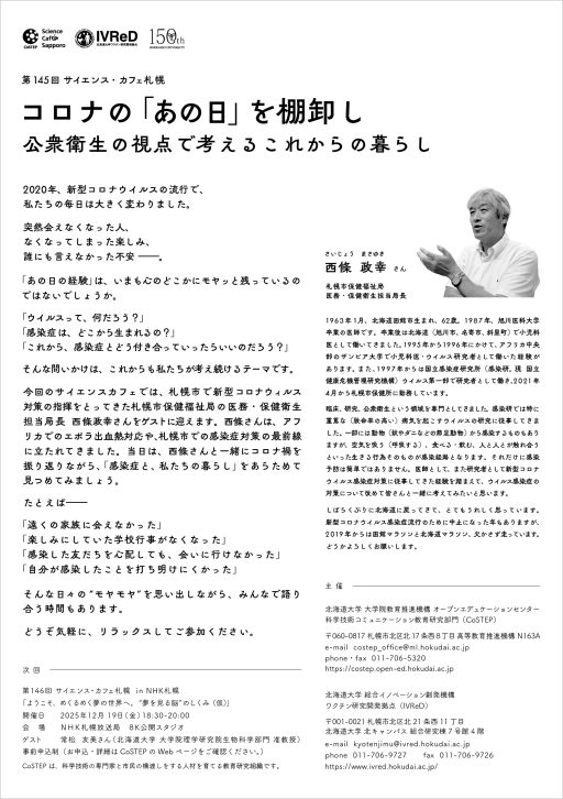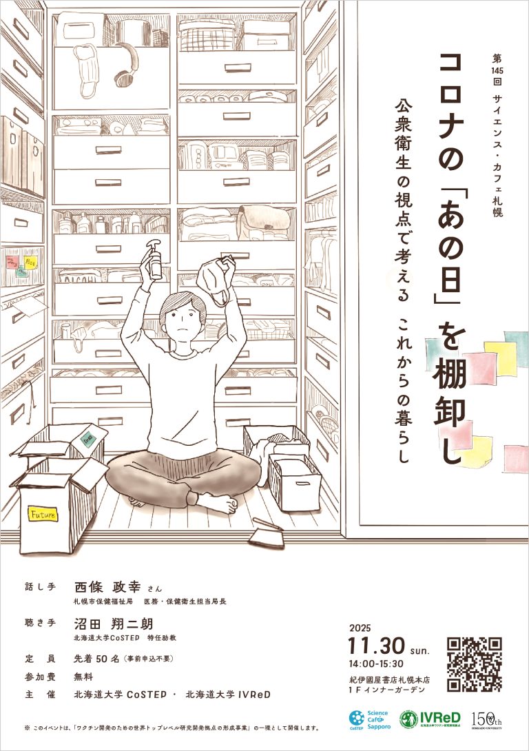 2025年11月30日(日)に紀伊国屋書店札幌本店1Fインナーガーデンにて、第145回 サイエンス・カフェ札幌「コロナの「あの日」を棚卸し-公衆衛生の視点で考えるこれからの暮らし」を開催します。北海道大学 総合イノベーション創発機構 ワクチン研究開発拠点 (IVReD)北海道大学 CoSTEPとの共同開催です。皆様のご参加をお待ちしております!